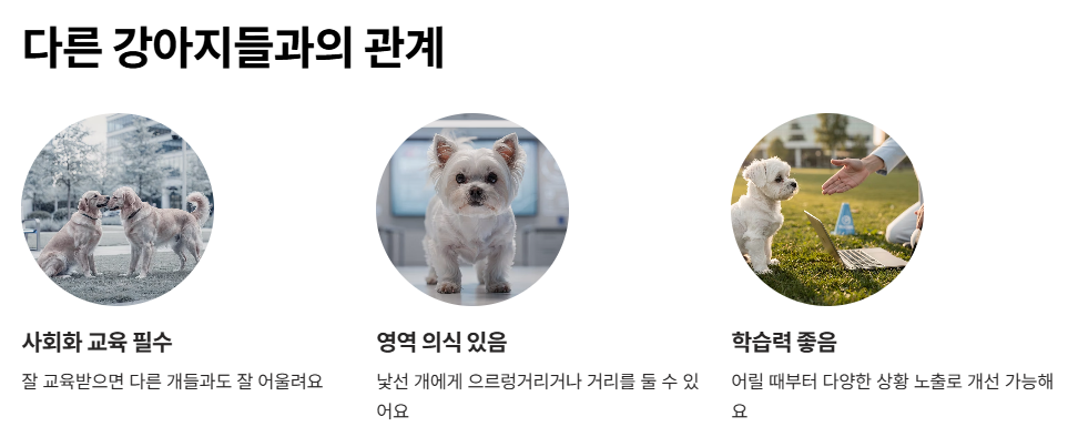 말티즈는 기본적으로 친화력이 좋고, 가족 구성원 모두와 유대감을 쌓으려는 경향이 있어서, 가정환경에서는 아주 좋은 반려견이 될 수 있어요. 무엇보다 보호자와의 유대가 깊기 때문에, 아이가 애정을 주고받을 수 있는 좋은 친구가 될 거예요.