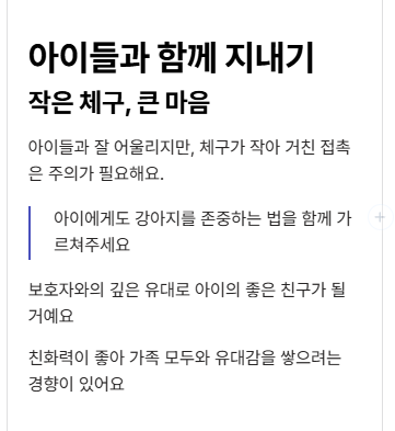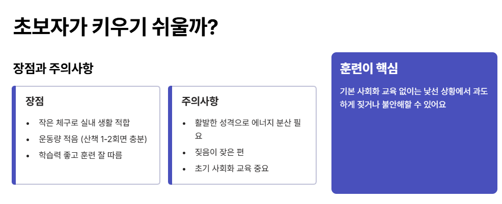 기본적인 사회화 교육을 해주지 않으면 낯선 상황에서 과도하게 짖거나 불안해할 수 있어요. 그래도 작은 체구 덕분에 실내생활에 잘 맞고, 운동량도 비교적 적은 편이라 하루 산책 한두 번이면 충분하답니다.