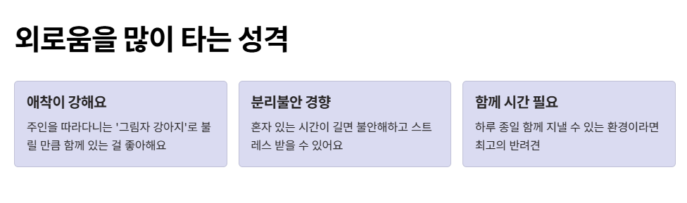 특히 주인을 잘 따르고, 혼자 있는 걸 그다지 좋아하지 않는다는 점도 눈에 띄어요. 그러다 보니 외로움을 많이 타고, 분리불안 경향도 조금 있는 편이에요. 하지만 그만큼 사람과 교감하는 데 아주 능숙하고, 애교가 많아 가족과의 유대가 깊어지는 강아지예요.