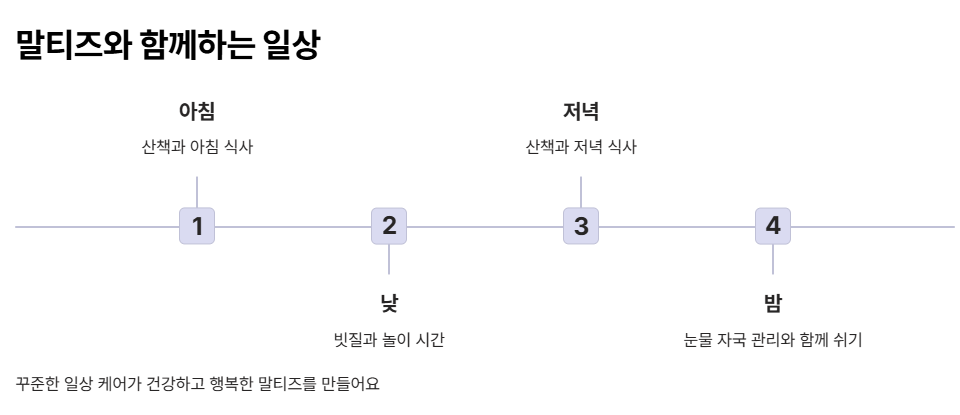매일 빗질은 물론이고, 눈 주변은 수시로 닦아줘야 하죠. 특히 여름철엔 털이 습기를 머금기 쉬워서 위생 관리에 신경을 써야 해요. 미용 주기는 4~6주에 한 번 정도가 일반적이에요.