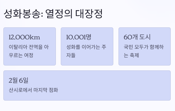 2026 동계올림픽의 성화봉송 여정은 이탈리아 전역을 아우르며 총 12,000km를 달립니다. 무려 10,001명의 주자가 이 상징적인 불꽃을 이어가며, 60개 도시를 통과한 후 개회식 당일인 2월 6일, 산시로 스타디움에서 대망의 마지막을 장식하게 됩니다.