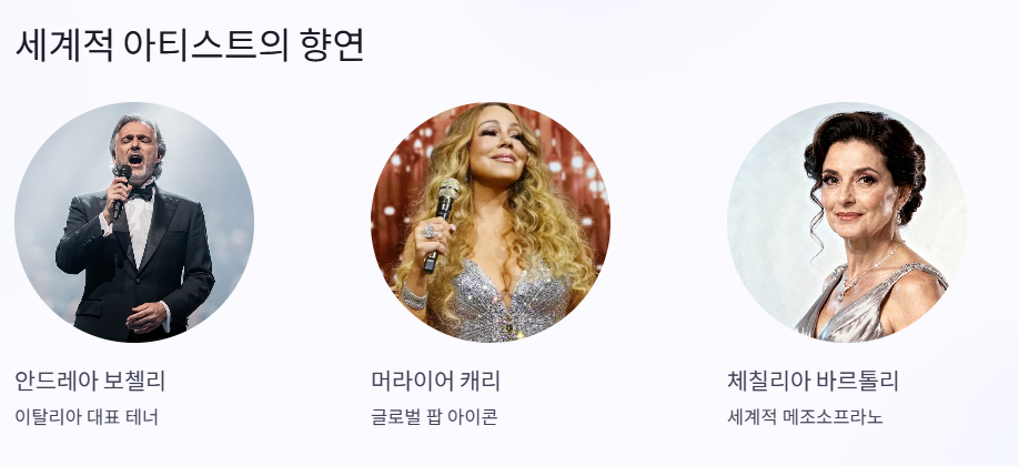 안드레아 보첼리, 머라이어 캐리, 체칠리아 바르톨리 등 세계적 아티스트의 공연은 대회의 품격을 한층 끌어올릴 예정입니다.
