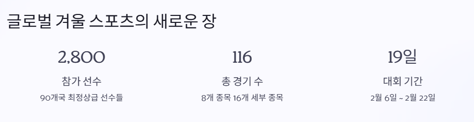 2026년 2월 6일부터 2월 22일까지 19일간 펼쳐질 이 축제는 전 세계 90여 개 국가올림픽위원회(NOC)에서 모인 약 2,800명의 선수들이 8개 종목, 16개의 세부 종목에 걸쳐 총 116개의 경기를 펼치게 됩니다.