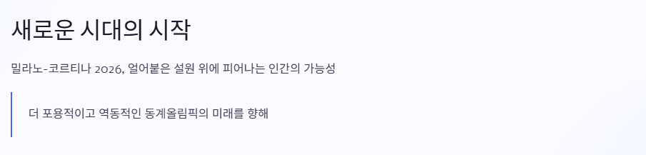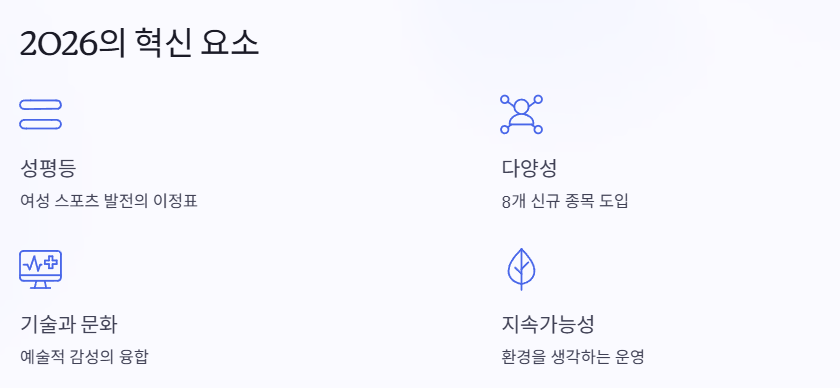 밀라노-코르티나 2026 동계올림픽은 단지 스포츠 경기가 아닌, 새로운 시대의 선언문입니다. 성평등, 다양성, 기술과 문화의 융합, 지속 가능한 경기 운영 등 모든 요소에서 혁신이 반영되어 있습니다.