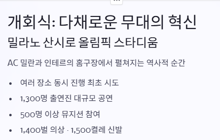 밀라노-코르티나 2026 동계올림픽의 개회식은 특별함 그 자체입니다. 기존의 한 장소에서 열리던 방식과는 다르게, 여러 장소에서 동시에 진행되는 복합적 개회식이 처음으로 시도됩니다.