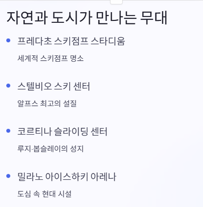 프레다초 스키점프 스타디움, 스텔비오 스키 센터, 코르티나 슬라이딩 센터, 밀라노 아이스하키 아레나 등은 이미 세계적인 대회를 수차례 개최한 바 있는 시설들입니다.