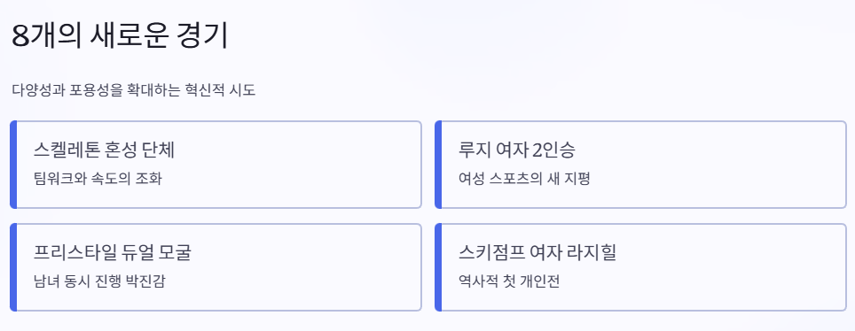 그 외에도 스켈레톤 혼성 단체, 루지 여자 2인승, 프리스타일 스키 남녀 듀얼 모굴, 그리고 스키점프 여자 라지힐 개인전 등 총 8개의 새로운 경기가 선보입니다. 이는 올림픽의 다양성과 포용성을 확대하는 데 큰 의미가 있습니다.
