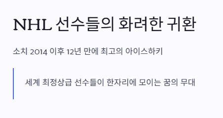또한, 소치 2014 이후 처음으로 NHL 소속 선수들이 참가하는 아이스하키 경기는 세계 팬들의 폭발적인 관심을 끌 것으로 보입니다. 이로써 아이스하키는 다시 한번 동계올림픽의 대표 종목으로서의 위상을 되찾을 전망입니다.