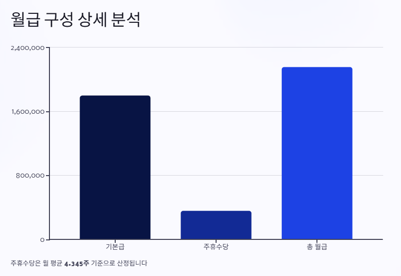 즉, 기본급 약 1,798,103원 + 주휴수당 약 358,777원 = 총 2,156,880원으로 계산됩니다. 이 금액이 2026년 기준 최저시급을 적용한 총 월급액이에요.