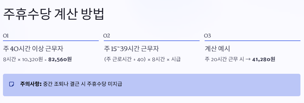 하루 8시간 × 시급(10,320원) = 82,560원 - 주 15~39시간 근무자 (파트타임 등):