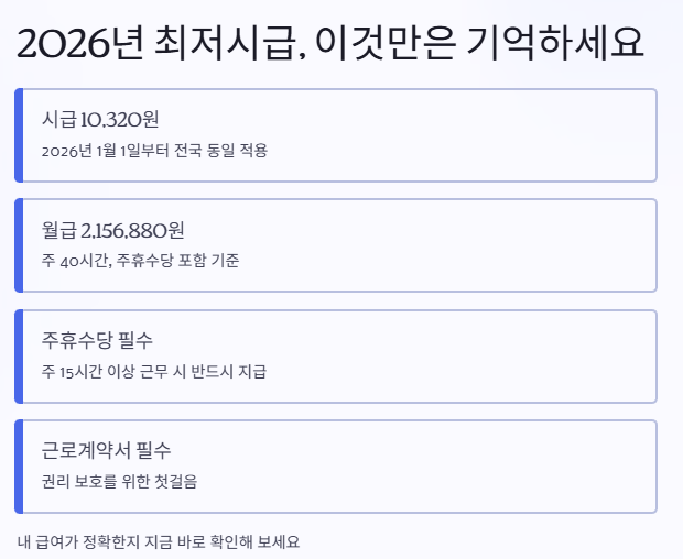 2026년 1월부터 적용되는 최저시급은 시간당 10,320원으로 확정되었습니다. 그에 따라 월급 환산 기준과 주휴수당 계산법도 함께 달라졌는데요. 2026년 알바 시급과 월급이 어떻게 바뀌는지, 이 글에서 모두 확인해 보세요.