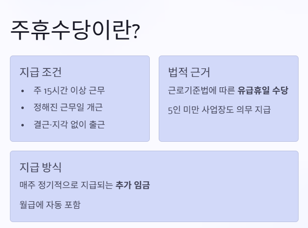 최저시급과 함께 많이 궁금해하시는 것이 바로 주휴수당이에요. 주휴수당은 근로자가 주어진 한 주 동안 정해진 근무일을 개근했을 경우, 사용자가 지급해야 하는 유급휴일에 대한 임금을 말합니다.
