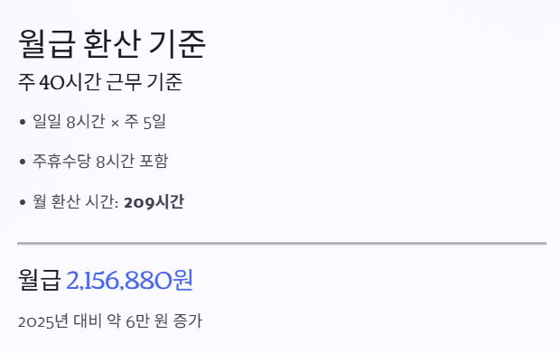 즉, 2026년 최저시급을 적용하면 월 약 215만 원을 받게 되는 거예요. 참고로 2025년 최저시급 기준 월급은 약 2,096,270원이었으니, 한 달 기준 약 6만 원 정도 오른 셈입니다.