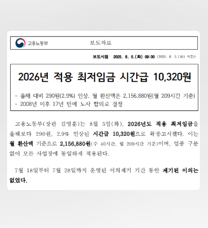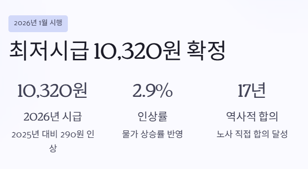 2026년 최저임금이 시급 10,320원으로 확정됐습니다. 2.9% 인상된 이번 결정은 월 환산 기준 215만 원을 넘기며, 근로자와 사업주 모두에게 적지 않은 영향을 미칠 것으로 보입니다. 어떤 변화가 있을