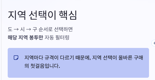 지역마다 규격이 다른 종량제 봉투 특성상, 잘못된 제품을 구매하는 경우가 생길 수 있는데요. 온라인 시스템은 이러한 부분을 자동으로 걸러주기 때문에 보다 안정적인 선택이 가능합니다.