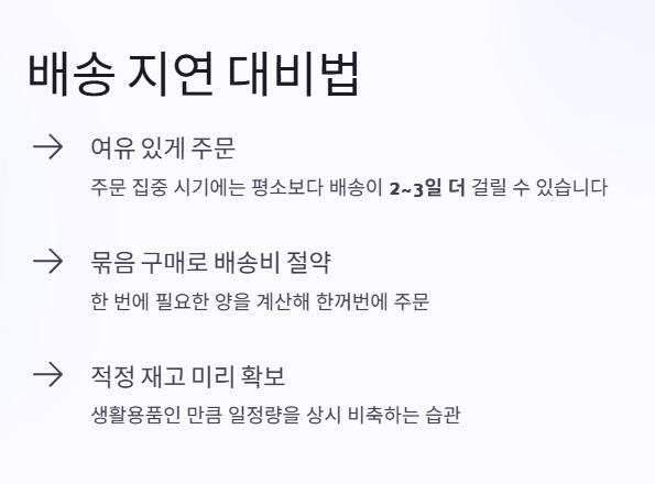조금만 신경 쓰면 더 효율적으로 구매할 수 있습니다. 우선 주문 시기를 여유 있게 잡는 것이 좋습니다. 최근처럼 주문이 몰리는 시기에는 배송이 평소보다 늦어질 수 있기 때문입니다.