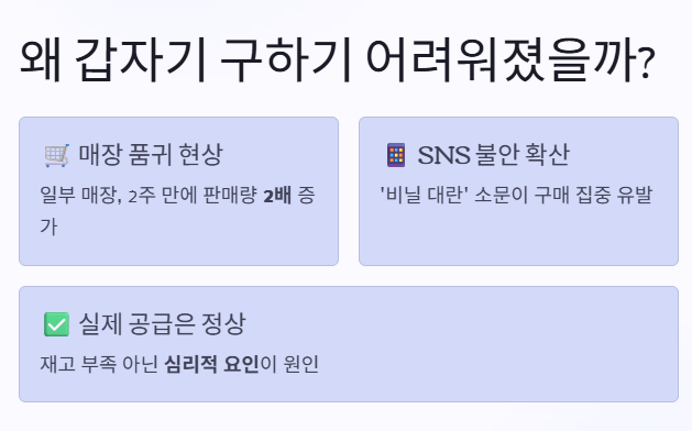 이런 변화에는 몇 가지 이유가 겹쳐 있습니다. 온라인을 중심으로 퍼진 비닐 대란이라는 이야기가 소비자 불안을 키웠고, 그 결과 구매가 한 시점에 몰리는 현상이 발생했습니다. 실제로 일부 매장에서는 판매량이 2주 전보다 두 배 가까이 늘었다는 사례도 확인되고 있습니다.