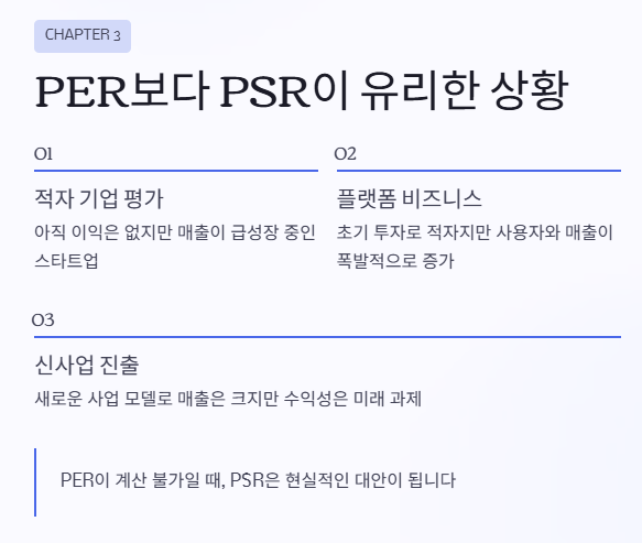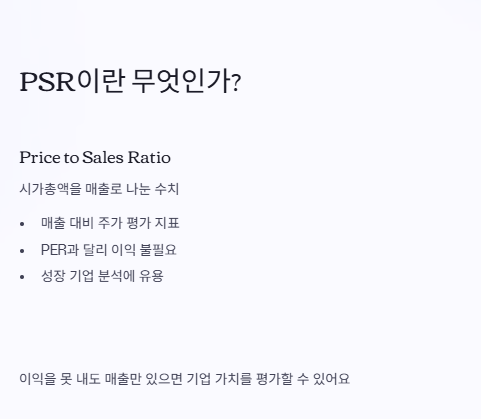 반면 PSR은 매출만 있으면 계산이 가능하니까, 이런 기업의 가치를 평가할 때 더 현실적인 기준이 될 수 있어요.