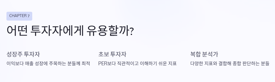 먼저, 성장주에 관심 많은 투자자에게 특히 유용해요. 이익이 아직 적거나 적자 상태라도 매출이 크게 늘고 있는 기업을 PSR로 걸러볼 수 있으니까요. 또한 밸류에이션 기준이 부족한 초보 투자자에게도 좋습니다.