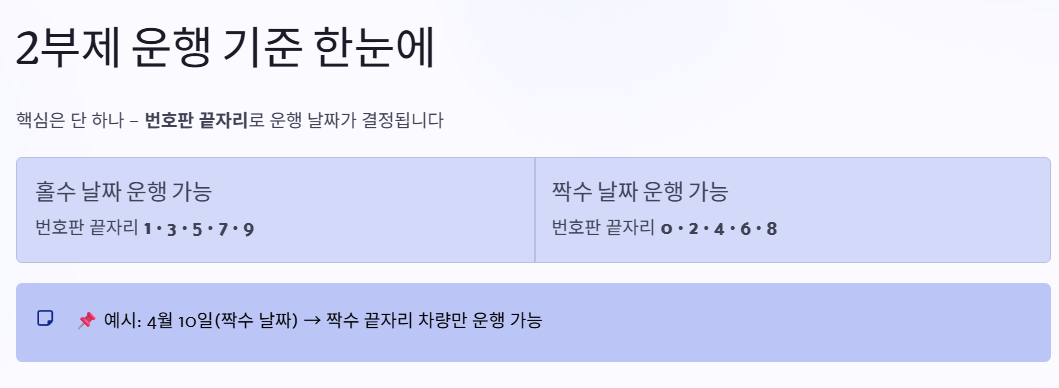 • 짝수 번호판 (0, 2, 4, 6, 8) → 짝수 날짜 운행 가능