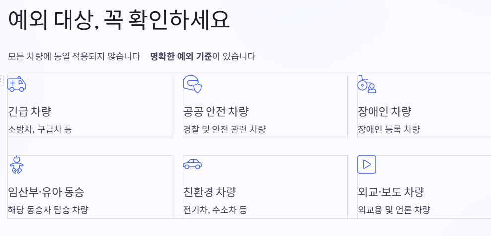 • 친환경 차량 및 긴급 차량 등 일부 예외 존재