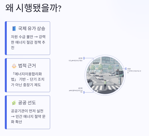 특히 「에너지이용합리화법」에 근거해 시행되는 정책인 만큼 단기적인 조치가 아니라, 중장기적으로 지속될 가능성이 높은 제도입니다. 실제로 일부 지자체에서는 통근버스를 확대하거나 공용차량 운행을 제한하는 등 추가적인 조치도 병행하고 있습니다.