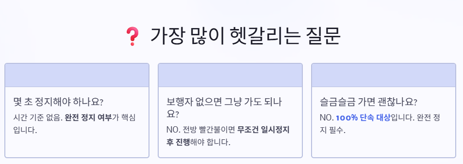 많은 운전자들이 속도를 줄이면 된다고 생각하지만, 실제 기준은 “완전 정지”입니다.