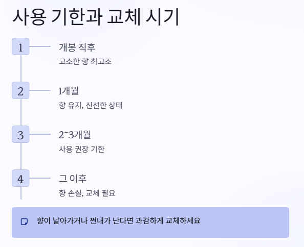 보통 개봉 후 2~3개월 안에 사용하는 게 가장 좋아요. 물론 보관 상태에 따라 조금 더 오래 쓸 수도 있지만, 향이나 색이 변하기 시작했다면 과감하게 교체하는 게 좋아요. 특히 고소한 향이 날아가고, 약간의 쩐내 같은 느낌이 들면 이미 산패가 진행된 거예요.