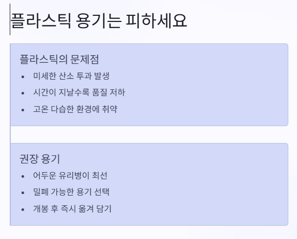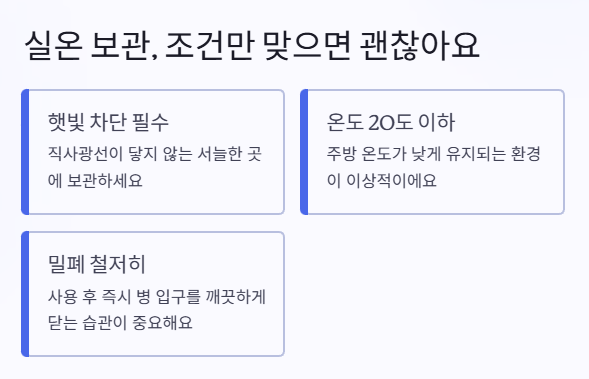 그 이상 올라가는 여름철에는 산패 속도가 빨라질 수밖에 없어요. 실온 보관하려면 병 입구를 깨끗하게 닫고, 사용 후 바로 닫는 습관이 무엇보다 중요해요.