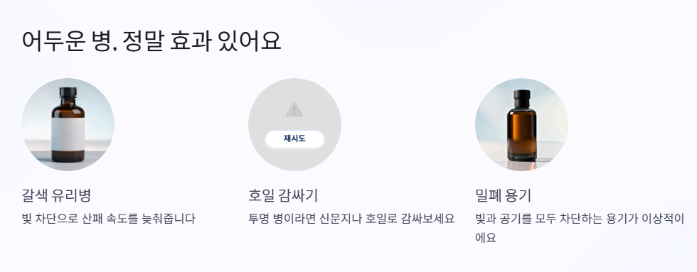 빛 차단이 어느 정도 되기 때문에, 실온 보관을 하더라도 갈색 병은 산패 속도를 늦추는 데 도움이 돼요. 집에서 보관할 때도 만약 투명 병이라면, 신문지나 호일로 감싸두는 것도 하나의 방법이 될 수 있어요.