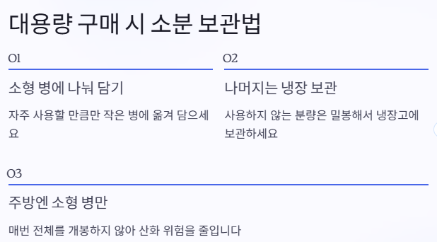 1리터 이상의 대용량 참기름을 구입하는 분들도 많죠. 이럴 땐 반드시 ‘소분 보관’을 추천드려요. 자주 쓰는 소형 병에 나눠 담고, 나머지는 냉장 보관하는 식으로요. 이렇게 하면 매번 전체를 개봉하지 않아도 돼서 산화 위험을 줄일 수 있어요.