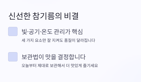 참기름은 향과 맛이 중요한 기름인 만큼, 어떻게 보관하느냐에 따라 품질 차이가 정말 커요. 실온 보관이든 냉장 보관이든, 핵심은 빛·공기·온도예요. 오늘 알려드린 방법만 기억하셔도, 참기름을 더 오래, 더 맛있게 즐기실 수 있을 거예요.
