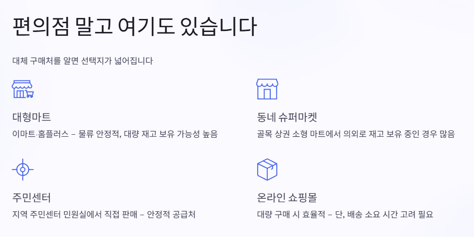 지역 동네 슈퍼마켓이나 주민센터도 판매처입니다. 온라인 쇼핑몰 주문도 가능하지만 배송 기간이 필요하죠. 급할 때는 오프라인 매장을 우선 확인하는 것이 효율적입니다.