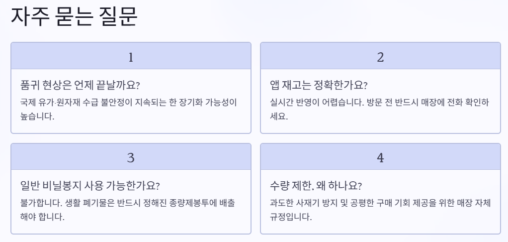 이는 생산 감소와 가격 인상으로 이어집니다. 일반 쓰레기봉투는 석유 기반 제품입니다. 원재료가 오르면 생산 단가가 급증합니다. 일부 사재기까지 겹쳐 매장에서는 구매를 제한하고 있어 소비자 불편이 커지는 상황입니다.