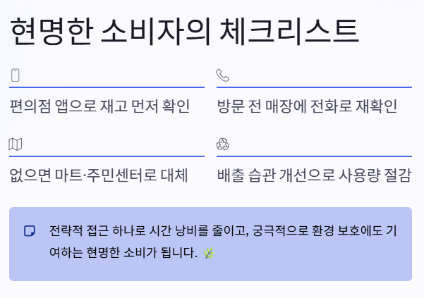 종량제봉투는 작지만 없어서는 안 될 중요한 생활필수품입니다. 현재와 같이 공급이 불안정한 시기에는 더욱 현명한 대처가 요구되죠. 무작정 매장을 방문하기보다 편의점 앱으로 재고를 확인하는 것이 좋습니다.