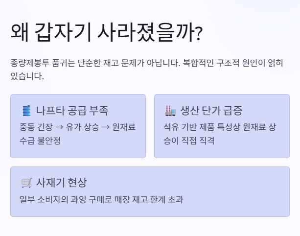 생활 폐기물 봉투 품귀 현상의 원인은 복합적입니다. 가장 큰 이유는 나프타 공급 부족합니다. 중동 긴장으로 유가가 상승하며 나프타 수급이 불안정해집니다.
