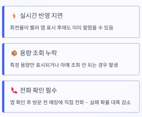 앱에는 있어도 이미 팔린 경우가 자주 발생합니다. 특정 용량만 조회되거나 조회가 안 될 때도 있습니다. 앱 확인 후 매장에 전화하는 것이 확실합니다. 이 한 단계로 실패 확률을 낮춰 시간 낭비를 줄있습니다.