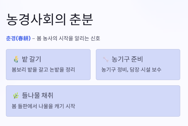 옛 농경사회에서 춘분은 농사의 시작을 알리는 신호와 같은 의미를 가졌습니다. 춘분을 전후로 농가에서는 다음과 같은 활동을 시작했습니다.