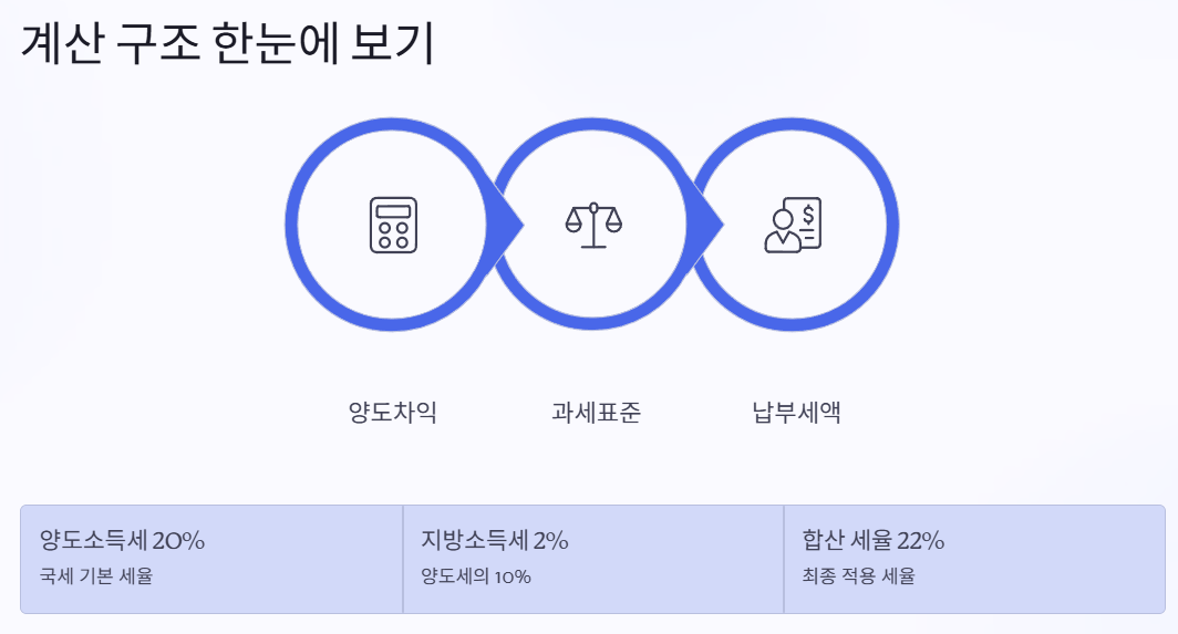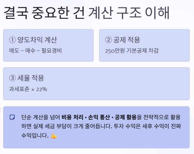 주식 양도소득세 계산은 복잡해 보이지만, 핵심 구조는 매우 단순합니다. 양도차익을 계산하고, 공제를 적용한 뒤, 세율을 곱하는 흐름만 이해하면 됩니다.