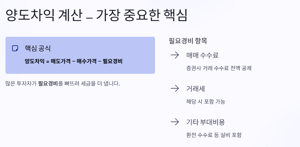주식 투자를 하다 보면 수익만큼이나 중요한 것이 바로 세금입니다. 특히 주식 양도소득세는 계산 방식이 단순해 보이지만, 공제와 비용을 제대로 반영하지 않으면 실제 부담이 크게 달라질 수 있습니다.