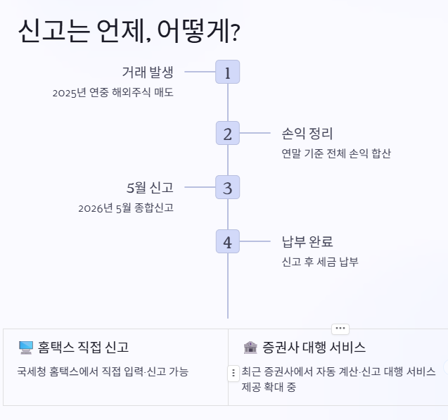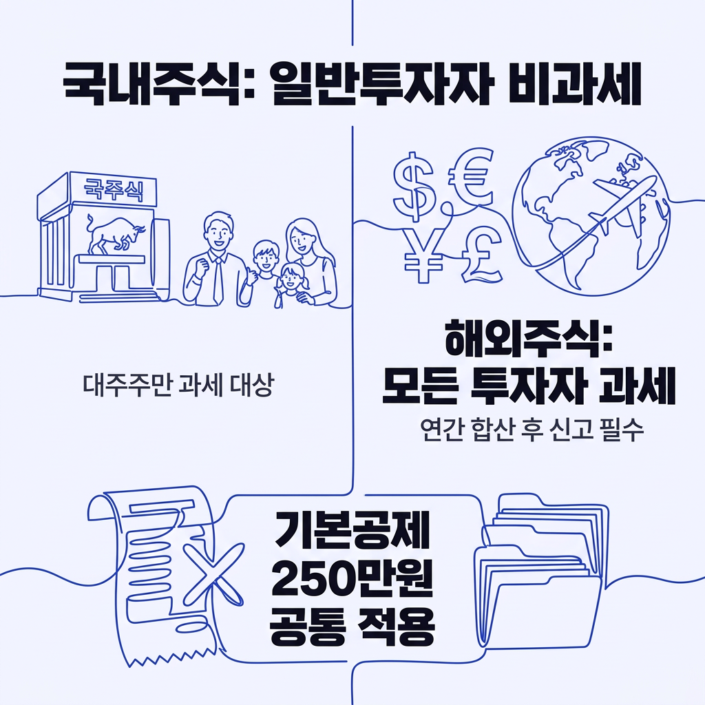 특히 해외주식 투자자는 대부분 양도소득세 과세 대상이기 때문에 반드시 계산 구조를 이해해야 합니다. 국내 주식 역시 대주주 요건에 해당하면 과세 대상이 되므로 방심할 수 없습니다.