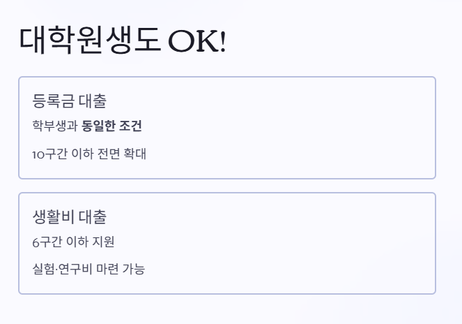 - 생활비 대출: 학기당 최대 200만 원, 연간 최대 400만 원