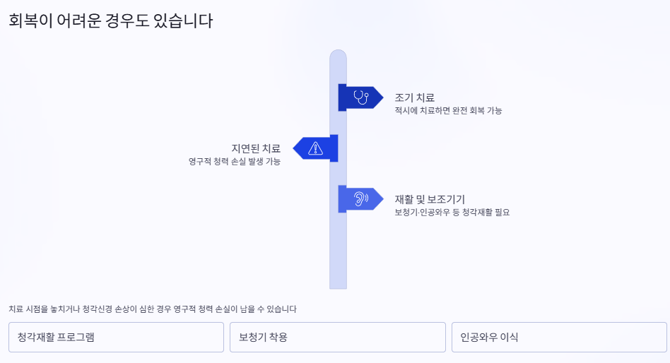 모든 돌발성 난청이 회복되는 건 아닙니다. 특히 치료 시점을 놓친 경우나, 청각신경 자체에 손상이 있었던 경우는 청력 손실이 영구적으로 남는 경우도 있습니다. 이 경우엔 청각재활, 보청기, 인공와우 이식 등의 추가적 대안이 필요할 수 있습니다.