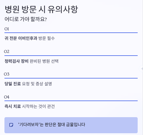 특히 청력이 남아 있는 상태에서 치료를 시작하는 게 관건이므로 ‘기다려보자’라는 판단은 절대 금물입니다.