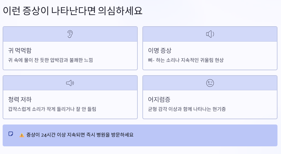 초기에는 귀가 먹먹하거나 울리는 느낌, 이명(삐- 소리), 청력 저하, 어지럼증 등이 동반될 수 있습니다. 귀 속에서 물이 찬 것 같은 불쾌한 압박감이 느껴지기도 하죠. 이 중 하나라도 24시간 이상 지속된다면 절대 무시해서는 안 됩니다.