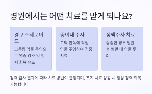대부분의 환자는 이비인후과에서 스테로이드 계열 약물을 중심으로 치료를 받게 됩니다. 초기에는 고용량 경구 스테로이드를 투약하거나, 상태에 따라 고막 안쪽 주사(중이내 주사) 또는 입원 후 정맥주사 치료를 받기도 합니다.