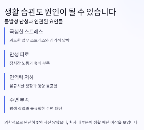 의학적으로는 3일 이내에 30 데시벨 이상의 청력 손실이 연속된 세 개 이상의 주파수에서 발생했을 때 진단됩니다. 문제는 많은 사람들이 처음엔 단순한 귀 막힘이나 피로감으로 여기고 병원을 늦게 찾는다는 점입니다.