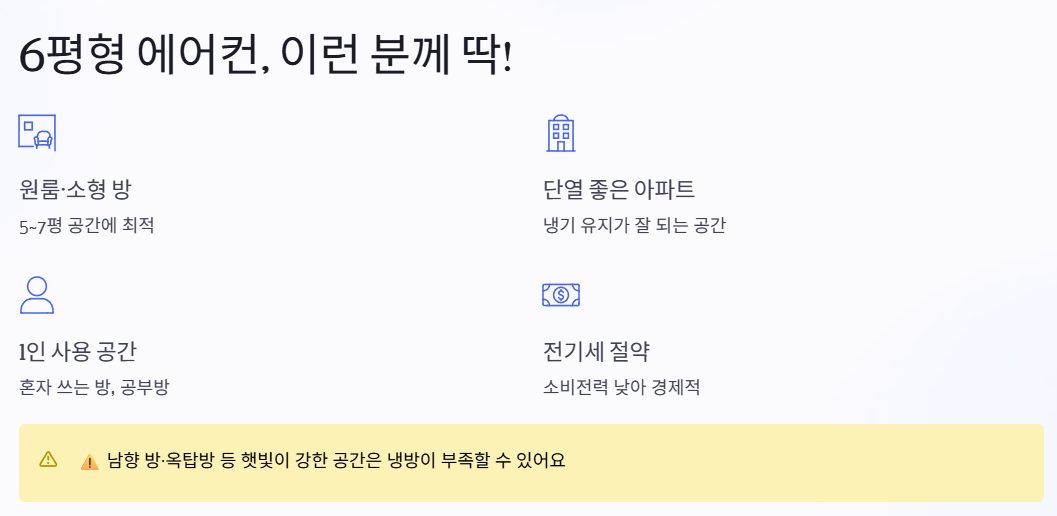 • 6평형 에어컨 → 작은 방, 원룸, 공부방